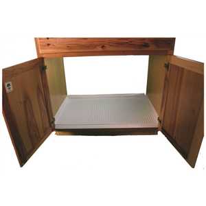 Trimmable under sink drip tray protects cabinets from spills and leaky plumbing or bottles.